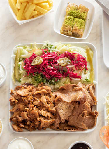 Chicken and lamb with lettuce, tomato, onion and garlic sauce.